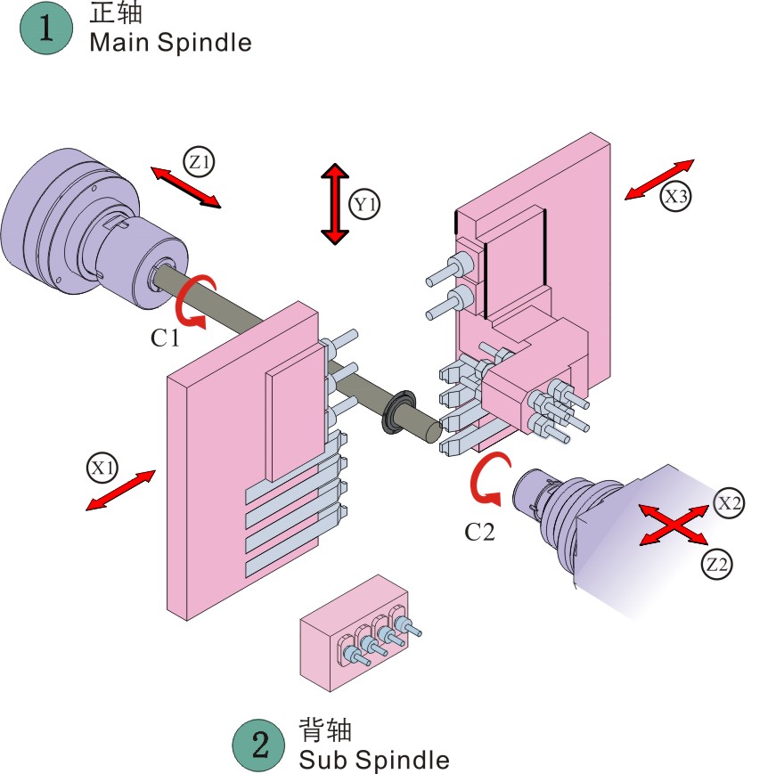 8、三通道控制方式,主軸端雙X軸控制兩把刀具同時與工件接觸,可實現兩側同時銑面、車削、打孔工藝,大大節省了加工效率。